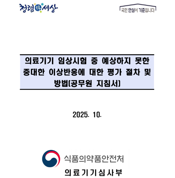 식품의약품안전처에서 '의료기기 임상시험 중 예상하지 못한 중대한 이상반응에 대한 평가 절차 및 방법 (공무원지침서)' 를 제정하였다.